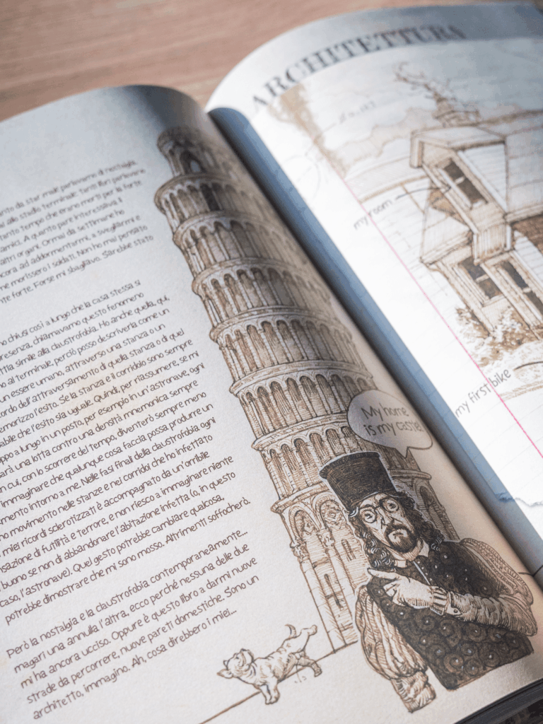 Infine, l’incredibile immagine de Il nuovo enciclopedista mette in scena l’istinto umano di catalogare tutto: un diario-enciclopedia illustrato per raccontare agli alieni chi eravamo, tra poesia e autoironia.